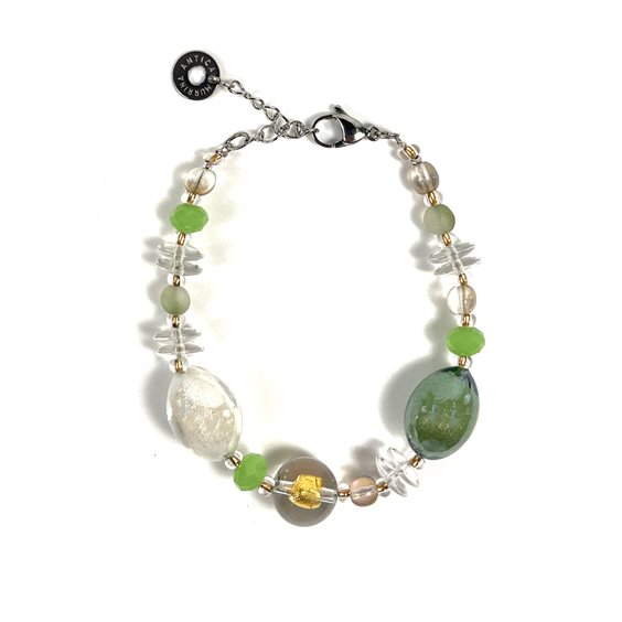 BRACCIALE AIDA TOP La linea Aida si ispira alla più classica tradizione Veneziana con linee semplici e colori tenui che più si adattano ad ogni tipo di occasione, la sua linea pulita la rende estremamente elegante, un pezzo senza tempo che racchiude in sé tutto il fascino del vetro di Murano. Le perle in vetro con lustro e mica la rendono luminosa e intramontabile. Lunghezza: 19-22 cm.
