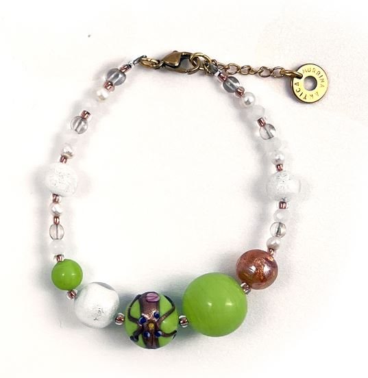 BRACCIALE NORMA TOP Questa linea, con tre varianti colore, è impreziosita con la perla di tipo fiorato: dipinta a mano, ornata con avventurina (minerale brillante) e lavorata con vette di vetro tirate a mano prima della creazione della perla stessa. Lunghezza: 19-22 cm.