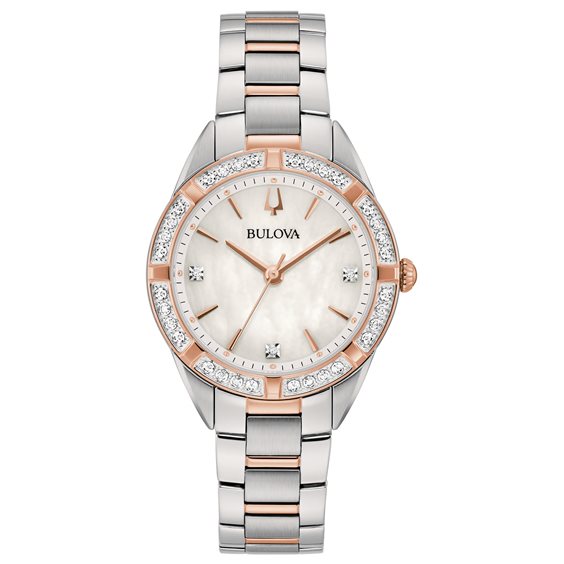 Orologio Donna solo tempo modello Sutton Lady Diamonds. Cassa in acciaio lucido e satinato, lunetta con particolari placcati oro rosa e 28 diamanti incastonati, corona oro rosa. Movimento al quarzo ore minuti secondi. Quadrante in madreperla con 3 diamanti, indici e lancette lucide placcate oro rosa. Vetro Zaffiro. Bracciale bicolore regolabile in acciaio lucido e satinato, chiusura deployante con pulsanti. Scatola Certificato Diamanti Libretto Istruzioni e Garanzia