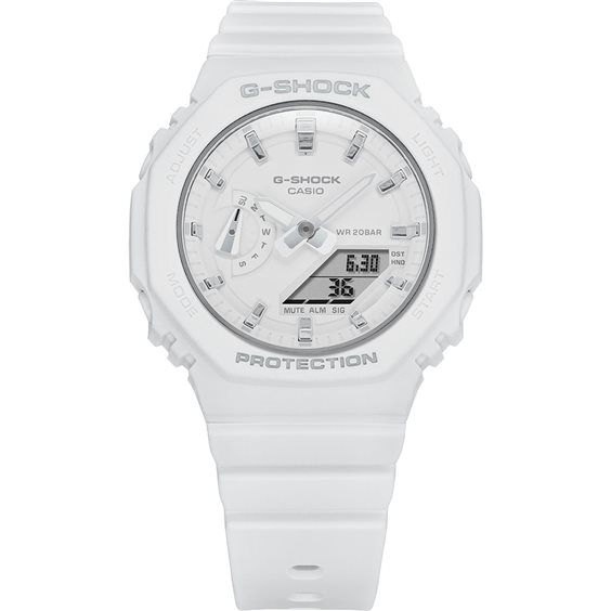 Orologio Analogico e Digitale Multifunzione Linea G-SHOCK con doppia illuminazione: una volta azionata la funzione si accendono sia la parte digitale che quella analogica. Antiurto: La costruzione anti urto protegge da colpi e vibrazioni. Neobrite: Indici e lancette hanno un rivestimento fluorescente verde che si illuminano al buio dopo lo spegnimento di una fonte luminosa Funzione ora mondiale: mostra l'ora di fino a 29 fusi orari. Cronometro: - 1/100 sec. Timer: - 1/1 sec. - 24 ore 5 allarmi giornalieri indipendenti per ricordare in modo personalizzato appuntamenti importanti. Funzione di spostamento delle lancette: Con la pressione di un tasto, le lancette si spostano permettendo la totale visibilità delle funzioni digitali. Attivazione/disattivazione del suono dei tasti. Calendario automatico. Formato 12/24 ore. Cassa in resina bianca rinforzata con carbonio: Grazie alla sua eccezionale tenuta, la resina rappresenta il materiale ideale per gli orologi. La cassa in resina rinforzata con carbonio - altro materiale particolarmente robusto - è ancora più resistente agli sbalzi e garantisce un alto livello di protezione dai fattori esterni. Il risultato è una tenuta straordinaria. Cinturino in resina bianca. Vetro minerale. Impermeabile 20 bar (atm). 3 anni circa la durata della batteria. Scatola libretto Istruzioni e Garanzia Originali.