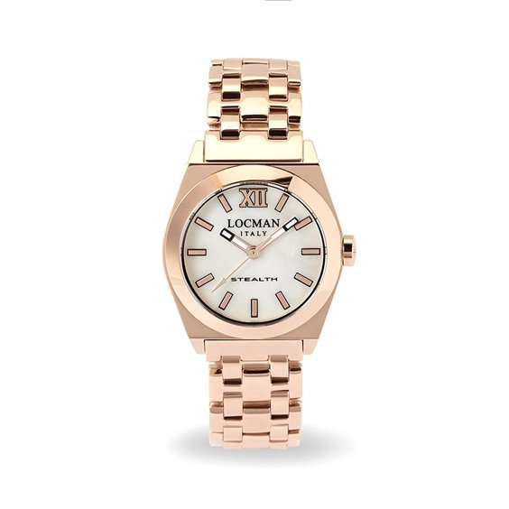 Orologio Locman Collezione: STEALTH - LADY Quadrante: colore bianco perlato; indicatore: combinazione di numeri romani e indici (applicati) Cassa: in acciaio e titanio, con trattamento PVD; dimensione 33 mm Movimento: solo tempo al quarzo Cinturino: bracciale in acciaio Vetro: minerale antigraffio, trattamento zaffiro Impermeabilità: 5 ATM