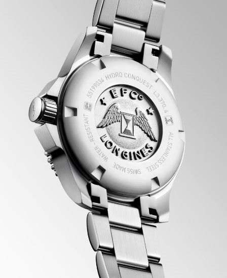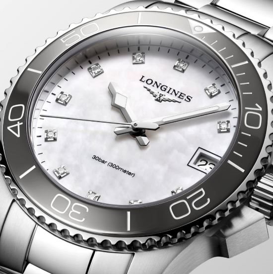HYDROCONQUEST, L3.370.4.87.6, orologio Al Quarzo, Ø 32.00 mm, Acciaio inossidabile e lunetta in ceramica. Date. Corona a vite Lunetta girevole unidirezionale, Impermeabile fino a 30 bar, Vetro zaffiro antigraffio con trattamento antiriflesso multistrato su entrambi i lati. Quadrante Madreperla bianca, Swiss Super-LumiNova®. Bracciale in Acciaio inossidabile, Con chiusura déployante a doppia sicurezza.