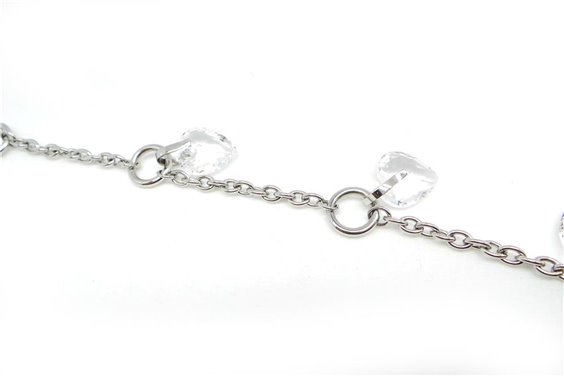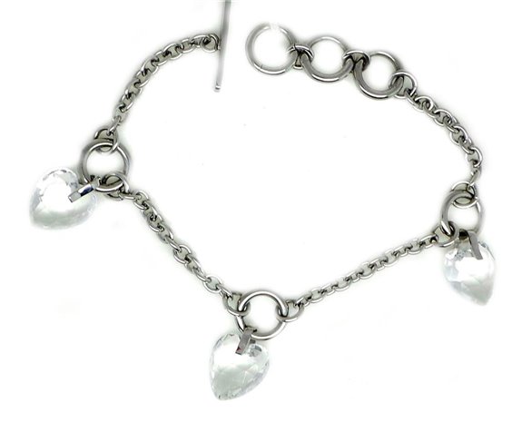 Bracciale Morellato in acciaio con tre cuori appesi, di cristallo sfaccettato, chiusura a T regolabile da 17-20 cm. Scatola e garanzia di 2 anni.