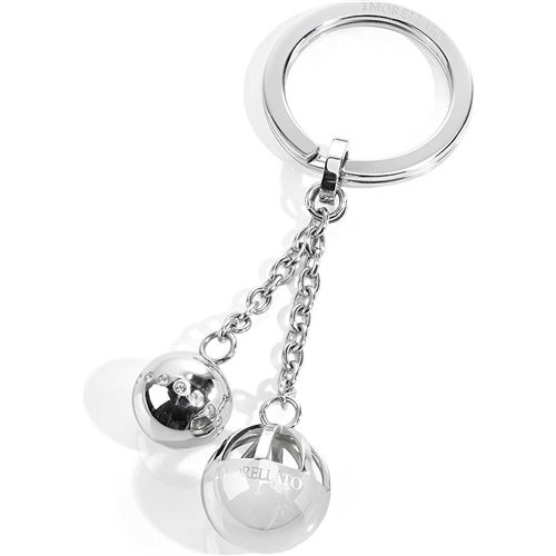 Portachiavi donna in acciaio 316L , lunghezza totale cm 9 , doppio sonaglio chiama angeli , cristalli bianchi.Immagine indicativa , la confezione può variare di forma e colore.