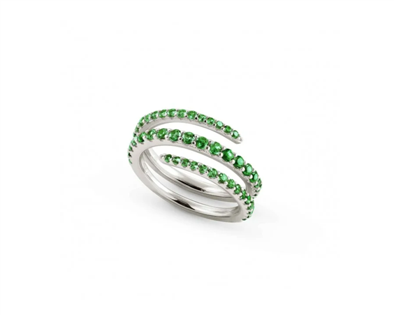 Anello in Argento 925 anallergico disponibile con rivestimento superficiale in Oro Giallo 750 o Rodio Bianco e Cubic Zirconia verdi. Altezza maglia: 0,8 cm.