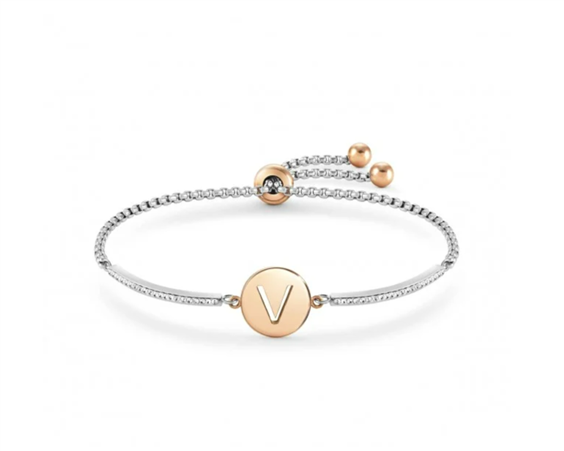 Bracciale con pendente con Lettera V in Acciaio 316/304 anallergico, dettagli in PVD rosa e pavé di Cristalli bianchi. Lunghezza 19 cm, adattabile a 14 cm. Misura del pendente 1,2 x1,2 cm.