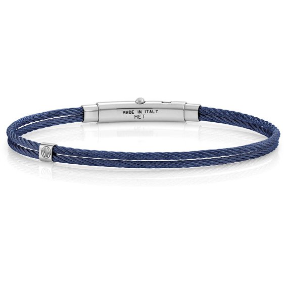 Bracciale doppio cavetto in acciaio inossidbile di colore blu; chiusura in acciaio con due possibilità di regolazione