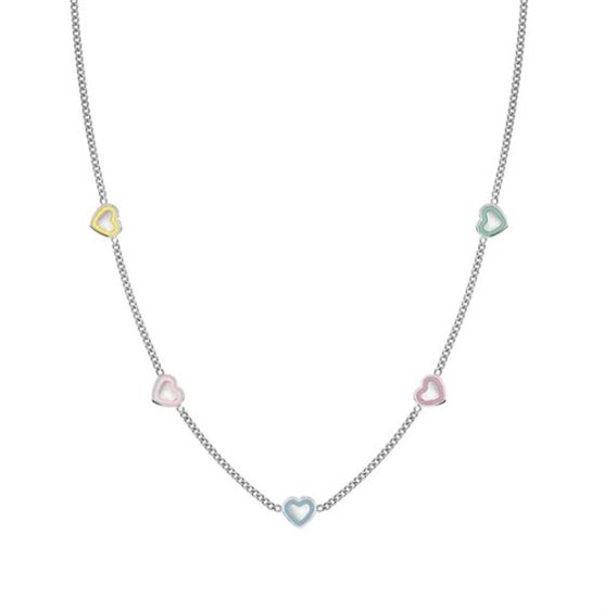 Collana Fairyicons Mix di Cuori Colorati Collana in Acciaio con Simboli in Smalto Collana in Acciaio, decorata con 5 piccoli cuori in Smalto colorato. Il regalo perfetto per le giovani romantiche che non rinunciano al loro look giocoso e vivace.