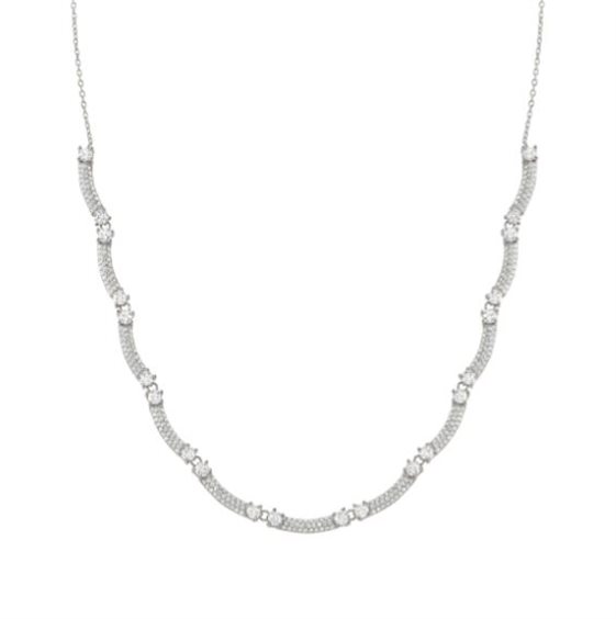 Collana Fashion Era con 11 placche rigide, 21 Cubic Zirconia bianchi alle estremità e pavé di Cubic Zirconia. Realizzata in Argento 925 arricchita da un rivestimento superficiale in rodio bianco. Un gioiello che esprime tutta la sua lussosità e preziosità grazie alle pietre che contribuiscono a creare un effetto cascata che ne esalta la lussuosità e il valore. Collezione Fashion Era Materiale Argento rodiato bianco Lunghezza min/max 38 cm / 42 cm Pietre preziose Cubic Zirconia Rivestimento superficiale realizzato mediante bagno galvanico. Chiusura con Cubic Zirconia bianco.