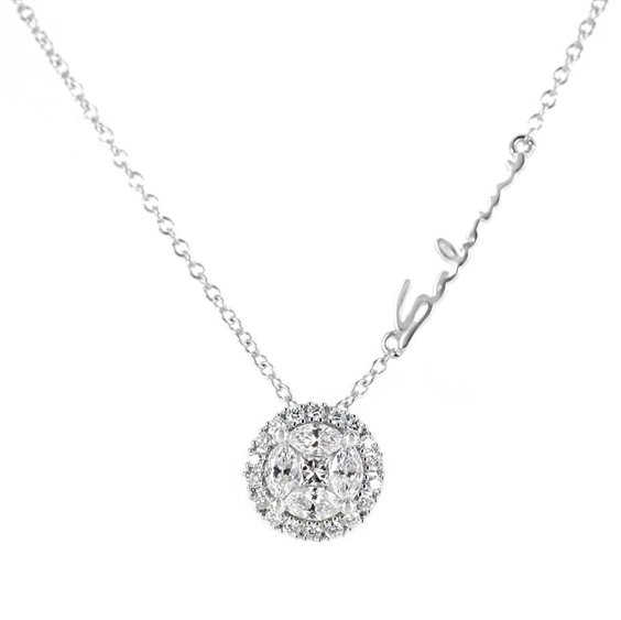 Collana con pendente Salvini effetto punto luce - collezione CLEOFE collana in oro bianco a titolo 18 kt - chiusura a moschettone, lunghezza del girocollo 42 cm. Diamanti naturali, taglio brillante rotondo, per carati totali 0.14, colore G-H Diametro del pendente effetto punto luce 8.00 mm