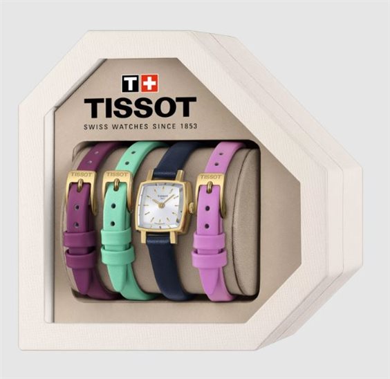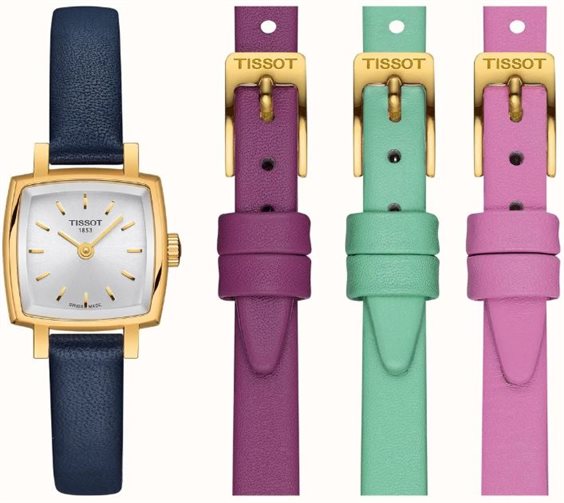 Caratteristiche principali della collezione t-lady lovely: gli orologi della linea lovely hanno una silhouette distinta. un vetro zaffiro antigraffio protegge il quadrante dell'orologio. Specifiche del modello: t0581093603103 la cassa quadrata in acciaio inossidabile rivestita in pvd oro giallo dell'orologio misura 20 mm di diametro. lancette a bastone dorate e indici a bastone dorati completano il quadrante argentato. questo modello è dotato di quattro cinturini intercambiabili a sgancio rapido. i cinturini sono tutti realizzati in pelle e sono disponibili nelle opzioni di colore blu, viola, verde e rosa. l'orologio è resistente agli schizzi e non deve essere immerso in acqua. tipo di movimento - quarzo