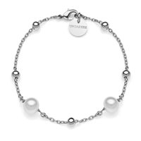 Bracciale di catena forzatina sottile in bronzo con sfere pi ccole lucide alternate a perle bianche naturali. Chiusura co n moschettone e medaglietta con logo. Simbolo per eccellenza